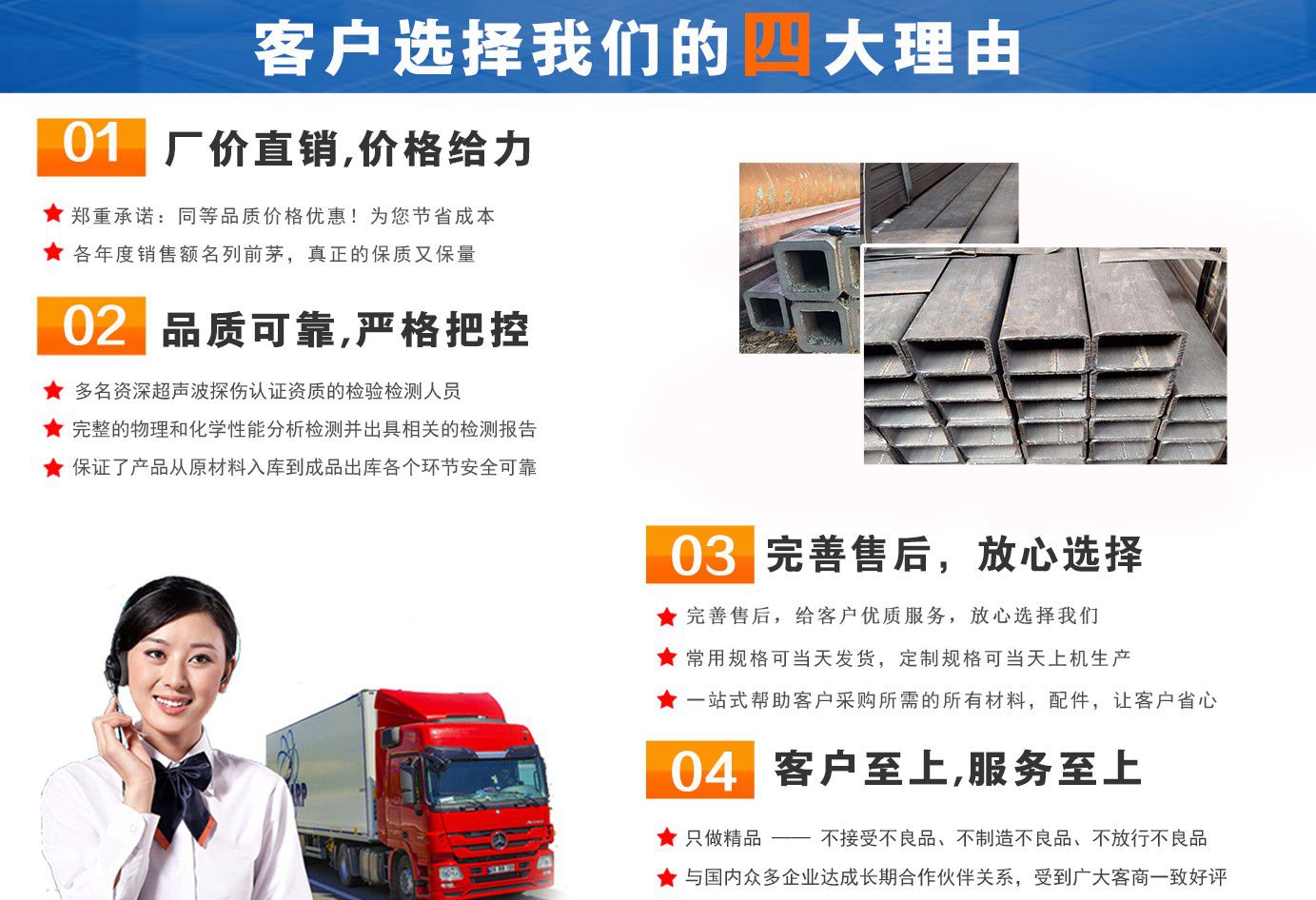 無錫盛灝特鋼有限公司長期銷售Q355B方矩管,鍍鋅方矩管,大口徑方矩管,厚壁方矩管,無縫方矩管等各種方管產品!產品廣泛應用于鋼結構建筑(鋼管混凝土、管樁、管桁架,橋梁、海上作業平臺、港口碼頭建設、電視通訊鐵塔、電力鐵塔等鋼結構管)。壓力管道(石油、天然氣、煤漿等輸送)、機械制輥等領域。 公司自創辦以來,一直堅持“誠信合作,共同發展”的經營理念?! ∫恢币詠砦覀儽局耙哉\相待,以信為本,互利互惠,共同發展”的長期方針,充分發揮現貨資源優勢為您提供“可靠的產品、過硬的質量、完善的服務”,歡迎廣大新老客戶前來洽談業務。 公司以“至誠至信,雙利雙贏”為根本宗旨,堅持科技興企的發展策略,恪守商規,創新進去,贏得聲譽,贏得了市場,得到了社會各階層的認可。公司以雄厚的實力、可靠的質量、儲存鋼管門類齊全、庫存量大之優勢,本著守法、守信、創新的理念,打造精品,發展鋼管多元化品種,滿足客戶各種需求,以低廉的價格、熱情的服務面向國內外客戶,歡迎鋼管界同仁加盟!我們為客戶提供周到的服務 ! 公司為客戶提供以下服務 服務三保: 保證質量、保證時間、保證數量?! 》兆谥迹?雄厚的實力、優質的產品、低廉的價格、周到的服務。 批零兼營,一支起定。...